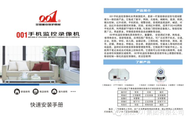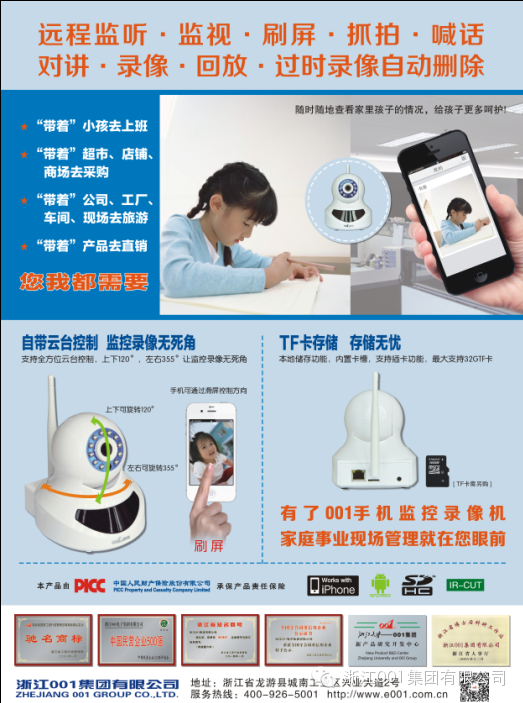 一臺微型低功耗長(cháng)壽命的移動(dòng)智能監控錄像機,具有監控、監聽(tīng)、現場(chǎng)監視、刷屏調節鏡頭、對話(huà)、喊話(huà)、抓拍、報警功能、錄像、紅外偵察、檢測、自動(dòng)錄像及刪除,若再配上門(mén)禁系統設備的,它的智能自動(dòng)化控制程度會(huì )更高更好。新一代001智能監控錄像機新產(chǎn)品,它單體就實(shí)現了云臺上下左右前后的遠程刷屏調向監視,采用TF卡進(jìn)行視音頻信號錄像等,它具有使用壽命長(cháng)、耗電省、體積小功能全、拍攝的畫(huà)面清晰度高、遠程監控、監聽(tīng)、抓拍、喊話(huà)使用方便,采用手機屏幕劃動(dòng)調節遠程鏡頭的方向,性?xún)r(jià)比高等優(yōu)點(diǎn),是新一代企事業(yè)單位、機關(guān)、證券、銀行、學(xué)校、超市、幻兒園、商店、店鋪、家庭、種植戶(hù)、養殖戶(hù)、臨時(shí)工程施工等領(lǐng)域,供領(lǐng)導或者項目、事業(yè)等負責人,進(jìn)行遠程利用手機實(shí)時(shí)抽查監管的智能好產(chǎn)品。